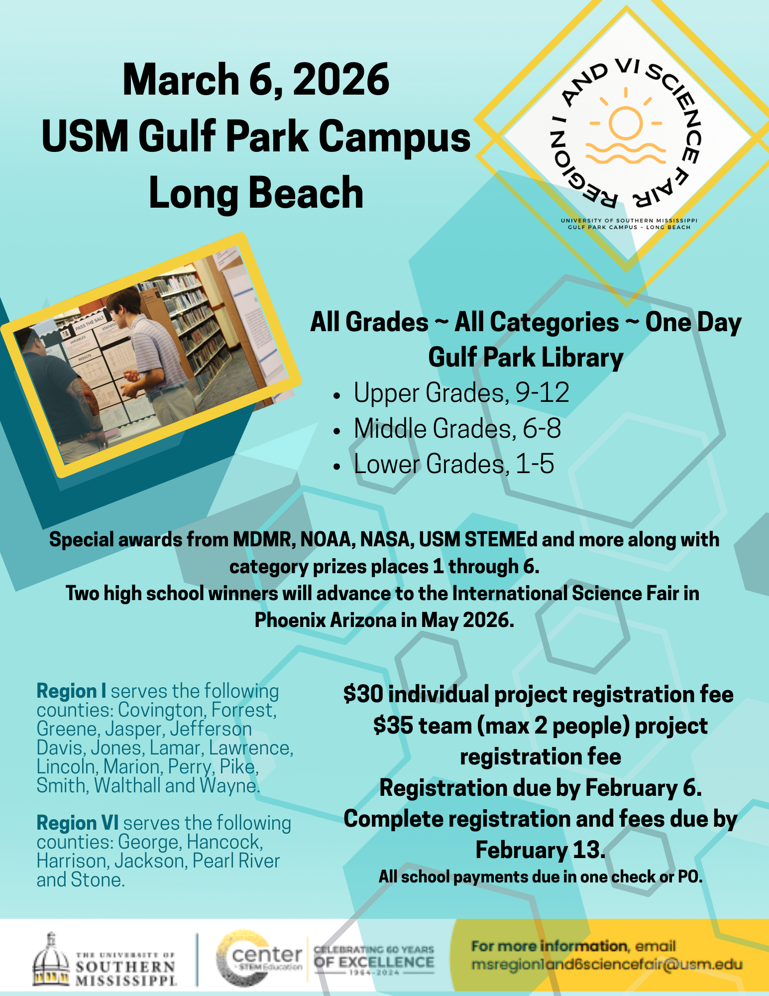 The Mississippi Regions I and VI Science and Engineering Fair is part of the Mississippi Science and Engineering Fairs Organization and an affiliated fair of the Society of Science sending two finalists to compete at the Regeneron International Science and Engineering Fair.